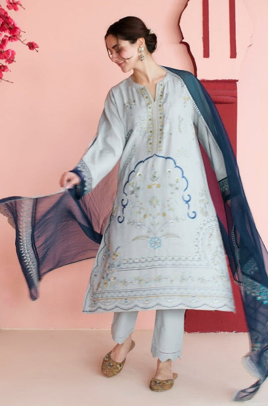 Mishkaa - 3PC Lawn Embroidered Shirt with Embroidered Khadi Net Dupatta (Unstitched) - RF1336
